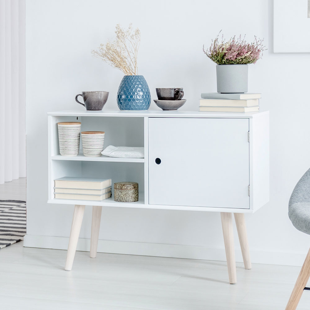 Universell einsetzbar ist dieses kleine Raumwunder. Durch die Füße erschein das Sideboard fast wie ein Wandregal, das über dem Boden schwebt. Somit wird der Raum durch das zusätzliche Möbelstück optisch nicht verkleinert. Die Konstrucktion mit Füße erleichtert zudem die Reinigung des Bodens.