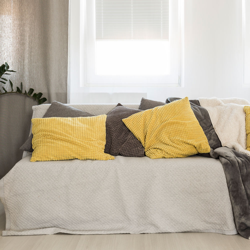 Jokki ist ein modernes Sofa in hellgrau. Es ist mit einer weichen Mikrofaser bezogen. Da sich diese nicht auf der Rückseite befindet, bietet es sich an, die Couch direkt vor einer Wand zu platzieren.